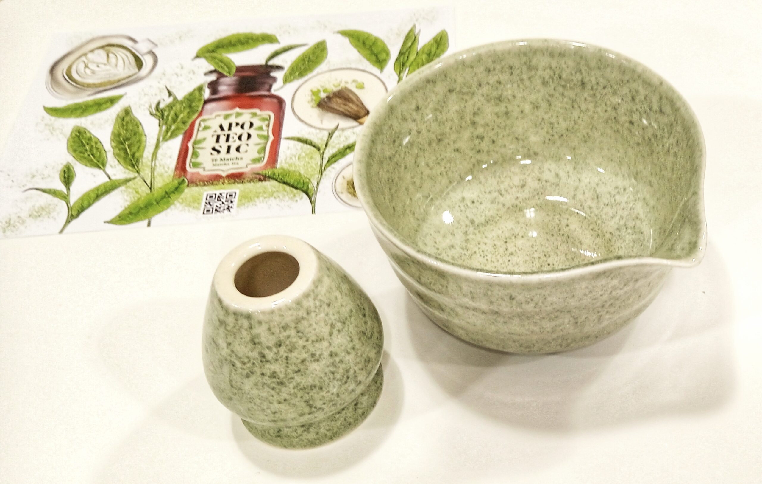 Conjunto de Bol Matcha y Soporte Chasen color verde moteado